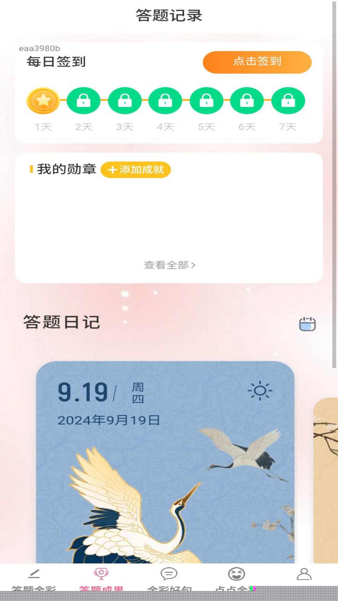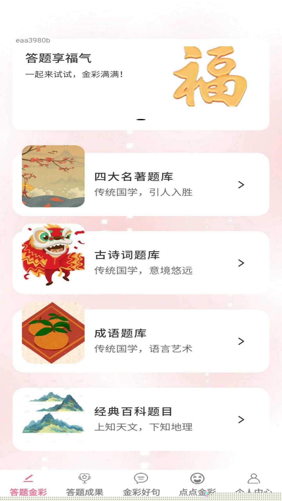 金彩答题是一款集知识学习、趣味互动与成长记录于一体的综合性移动应用,通过多样化的答题模式与内容体系,帮助用户在轻松氛围中拓展认知边界、积累学识并提升思维活力。应用融合了日常知识问答、经典语句赏析及个性化学习轨迹追踪等功能,打造一个兼具教育意义与娱乐体验的智慧平台,让使用者在探索答案的过程中感受持续收获的成就感。