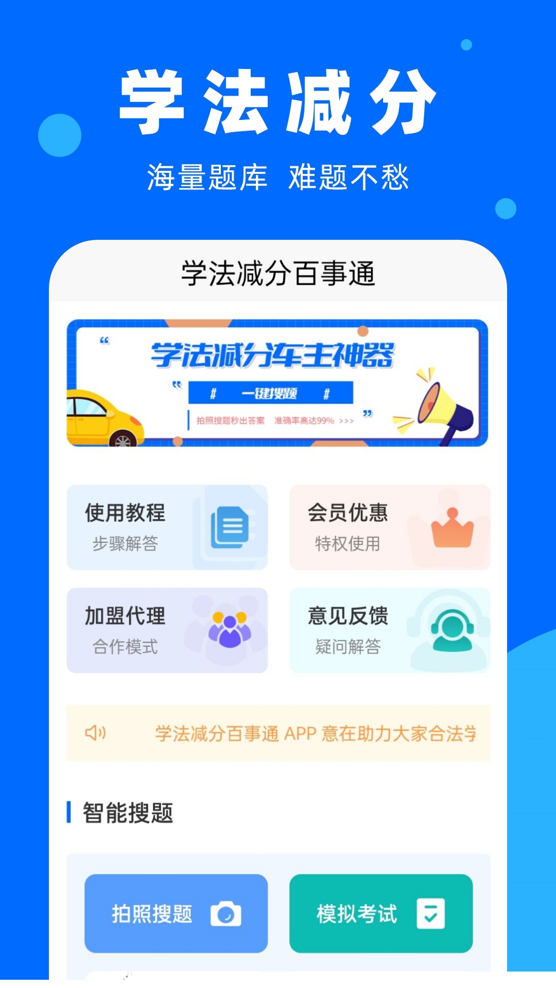 学法减分百事通是一款专为机动车驾驶员设计的在线学习教育辅助应用,帮助用户高效备考驾驶证相关的学法减分、审验教育及满分教育考试。其核心功能是通过图像识别技术,对用户拍摄的驾考题目进行快速解析,并从庞大的题库中精准匹配答案,显著提升学习与备考效率。应用内容与官方考试大纲同步更新,整合了最新的交通法规与题库资源,结合智能学习路径规划,为驾驶员提供系统化、个性化的学习支持,是驾驶员提升交通安全知识、顺利完成驾驶证相关考核的实用工具。