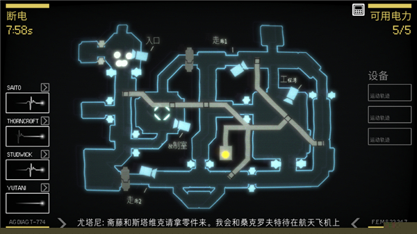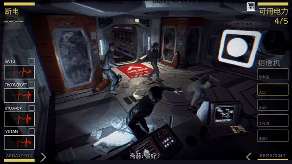 核心玩法围绕远程监控与资源管理展开。身处相对安全的终端室,通过调取空间站内各个区域的摄像头画面来掌握全局。画面中的白色光标代表可互动的船员或设备,黄色标识则代表已因电力耗尽而关闭的设施。主要目标是引导分散的船员前往安全舱室或完成特定任务,避开游荡的异形。
