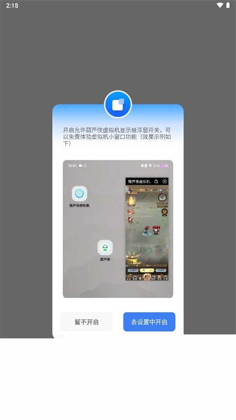 首次启动时,根据引导提示进入系统设置界面,找到显示在其他应用上层或类似权限选项,为葫芦侠虚拟机授权即可启用悬浮窗功能。
