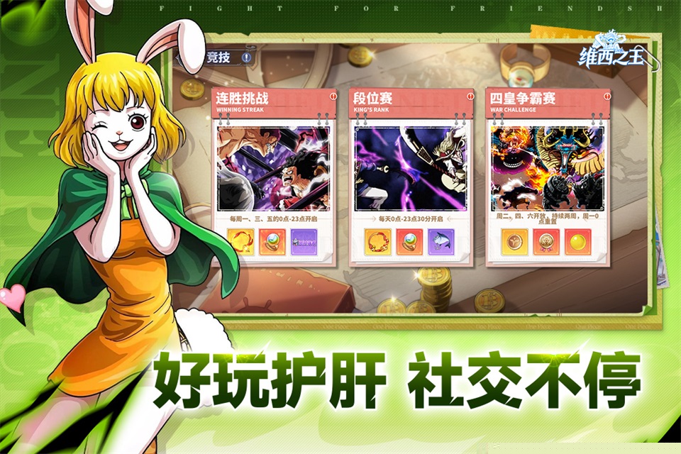 维西之王是一款以经典动漫为背景的放置卡牌回合制游戏,将进入宏大的航海世界,招募并培养各具特色的伙伴,组建强大的航海团队。通过策略性的阵容搭配与角色养成,探索广阔海域,挑战强敌,体验一段充满热血与冒险的旅程。游戏以轻松放置与深度策略为核心,为带来持久的收集与成长乐趣。
