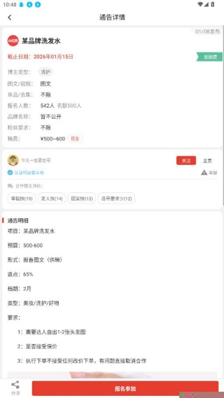 首先需要完善个人资料,创建并认证您的跨平台名片。完成后,即可在通告广场浏览各类合作机会,根据自身条件与兴趣进行筛选和报名,报名通过后即可查看商家联系方式并开始合作。