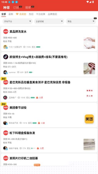 根据平台类型、粉丝量级、奖励形式、品类偏好等多维度条件,在通告广场中筛选合适的商业合作机会,快速定位目标项目。