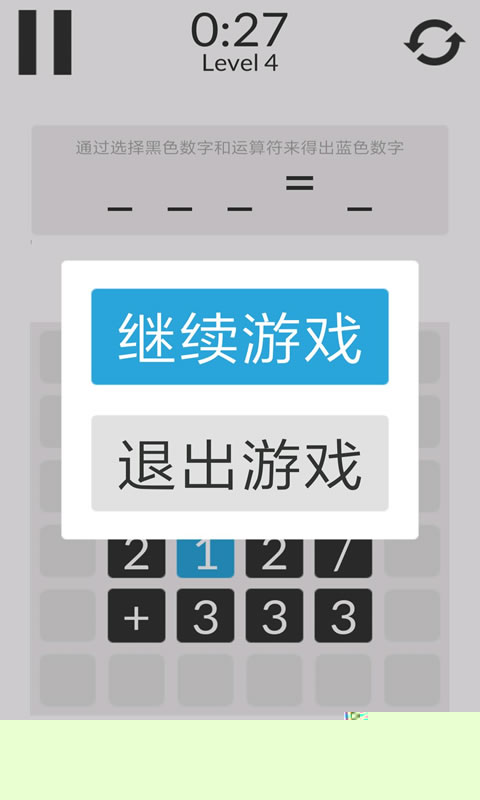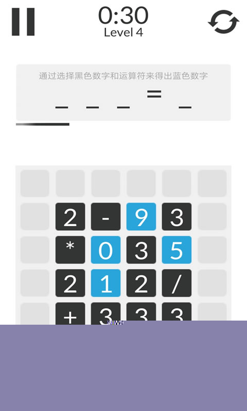 4、点击选择黑色数字和运算符形成计算式,当计算式的结果等于蓝色数字时,可进入下一关
