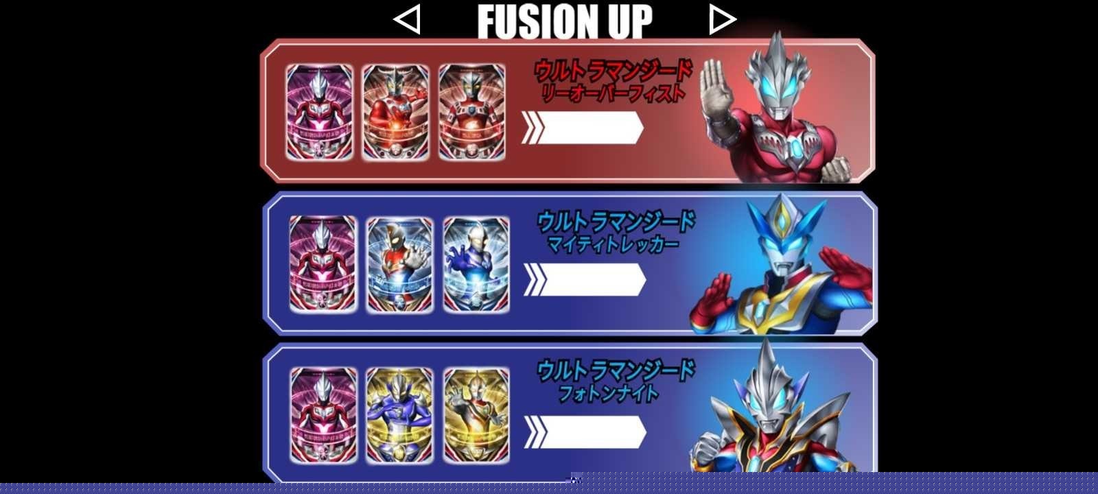 进入变身:点击屏幕中间的变身器,变身器进入变身状态。此时玩家可选择要融合变身的奥特曼卡片,选完三张卡片后,再次点击变身器即可融合变身奥特曼。