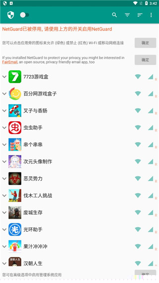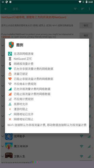 为每个已安装的软件独立设置其在Wi-Fi网络和移动数据网络下的访问权限,通过直观的图标颜色(如青色允许、橙色阻止)进行快速切换,实现对特定应用联网行为的精准管理。
