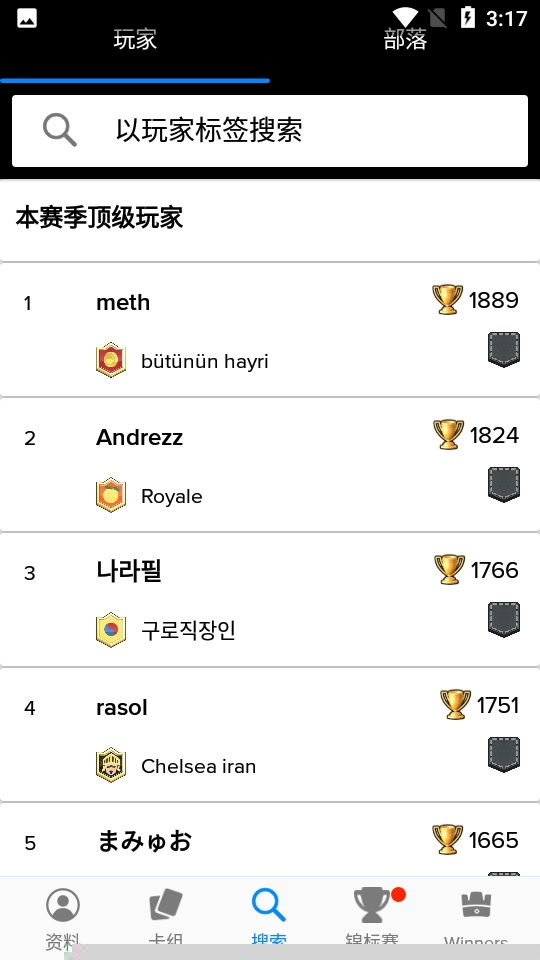 支持通过唯一的标签进行精确搜索,可快速定位并查看任意或部落的详细资料、对战历史与成就信息。