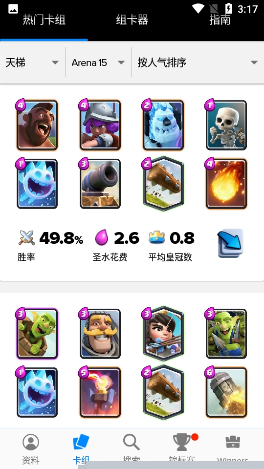 功能模块涵盖热门天梯卡组、竞技场适配卡组以及高人气卡组筛选,提供每套卡组的详细玩法攻略与对战思路,解决在面对复杂对局时缺乏有效战术体系的痛点。