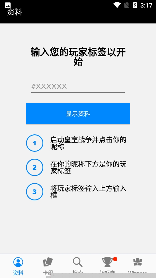 在应用内指定位置输入皇室战争个人资料中的标签(以#开头的一串字符),系统即可自动拉取并展示您的全部公开游戏数据,包括奖杯、卡牌等。