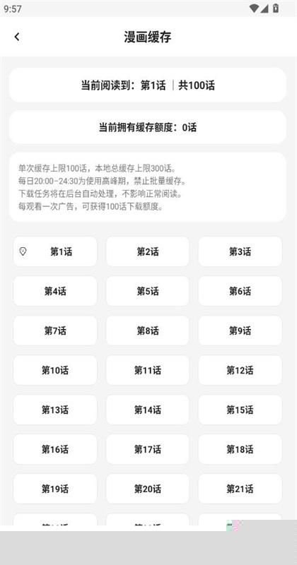 在漫画详情页面,可以找到缓存功能入口。点击后进入章节选择列表,勾选需要保存的集数。