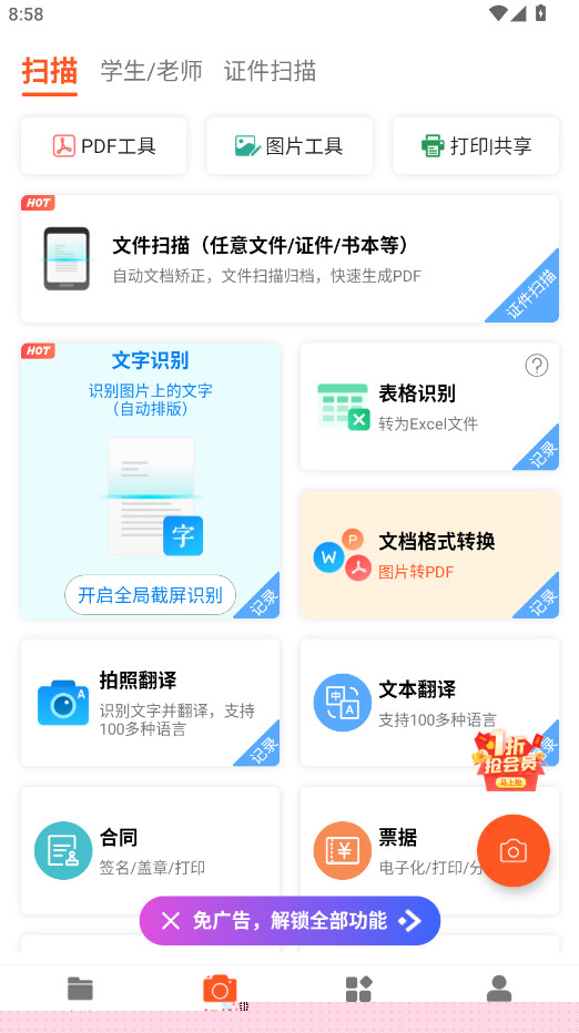 PDF扫描王是一款能帮你轻松搞定纸质文件数字化的得力助手,无论是合同、发票、手写笔记还是书籍页面,只需用手机摄像头一拍,就能快速生成清晰规整的电子文档能精准识别图片中的文字,还集成了格式转换、编辑管理和多语言翻译等一系列贴心功能,让文档处理变得前所未有的高效和简单,彻底告别繁琐的手动录入与杂乱的文件堆。