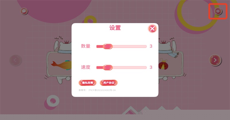 1.、点击右上角设置,选择逗猫玩具显示的数量、运行速度。