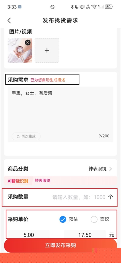 2、在发布页面,上传商品图片/视频,系统会自动生成采购需求描述,也可手动编辑完善,确认商品分类(系统可AI智能识别),填写采购数量,设置采购单价(可选择预估区间或面议),补充联系电话等信息后,点击"立即发布采购"按钮,提交找货需求;