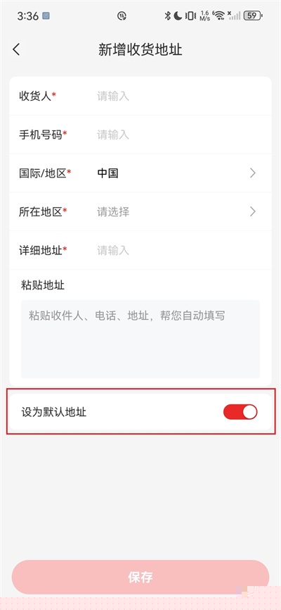 4、在新增收货地址页面,填写好个人信息,可选择开启"设为默认地址"开关,将该地址设为默认收货地址,确认信息填写完整后,点击底部"保存"按钮,完成收货地址添加。
