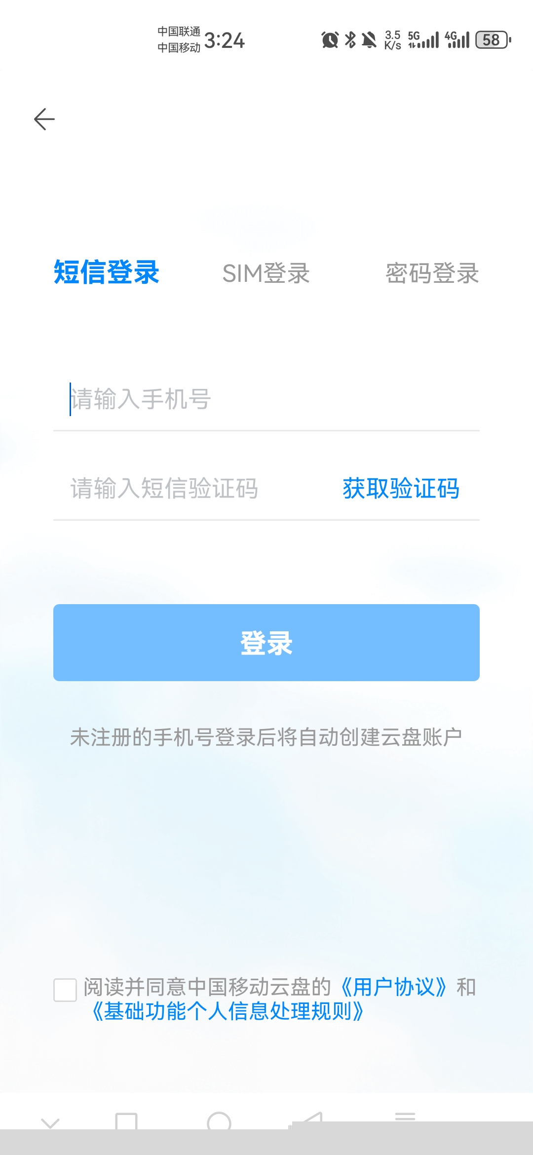 4.选择短信登录、密码登录等等,如果是短信登录,请输入自己的手机号码和短信验证码,再点击勾选同意协议,点击登录即可。此处注意的是未注册的手机号登录后将自动创建云盘账户。