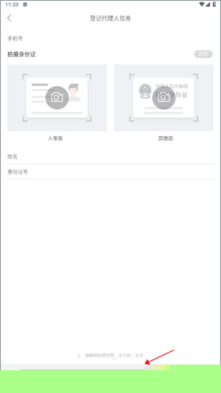 3、请拍摄代理人本人的身份证正反面照片,系统将自动完成姓名和身份证号的识别,确认信息无误后提交。如姓名、证件号、手机号与授权的代理人信息不一致则无法完成验证。