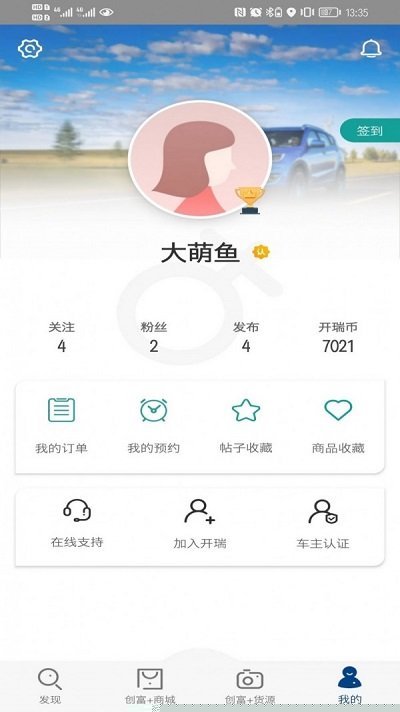 1、首先打开开瑞汽车软件,进入到首页中可以切换到商城、爱车、服务、我的页面,我们点击右下角的【我的】;