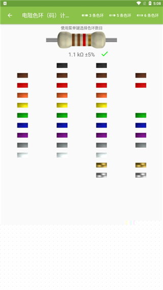 利用内置的电阻色码解码器工具。您无需记忆色环顺序规则,只需在交互式色环图上,从第一环开始,依次点选电阻上看到的颜色。每选择一个颜色,下方会实时显示当前解读的阻值和进度。全部选完后,最终阻值、公差及温度系数(如有)会一并给出,直观且零误差。