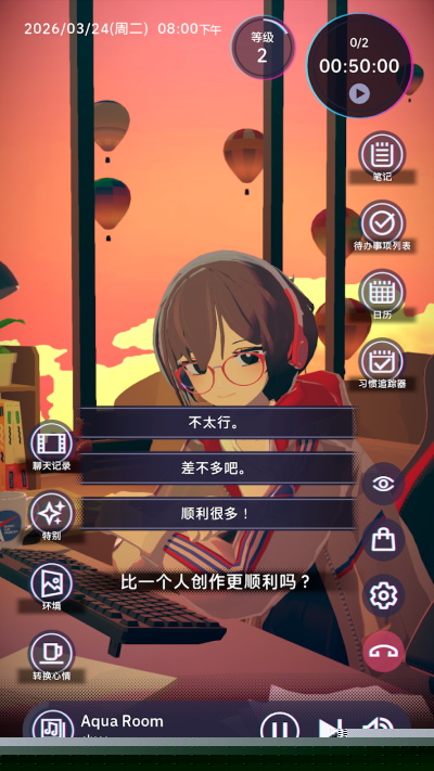 核心体验围绕专注与陪伴展开。主要目标是利用内置工具管理个人事务,在与聪音共处的时光中,逐步了解她的故事。启动后,建议先于界面右侧设定一个简短的待办事项,并开启番茄钟开始计时。在此期间,背景音乐与画面将共同作用,帮助你进入工作或学习状态。计时结束后,会进入休息阶段,此时可与聪音进行对话,这些互动是推进主线及支线剧情的关键。