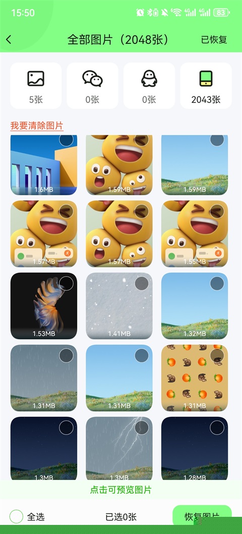 扫描结果会分类显示,清晰区分出聊天图片、收藏图片或缓存图片,便于选择性恢复。