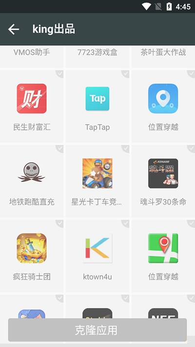 在king优化框架主界面,点击添加应用按钮,从列表中选择目标游戏,框架会为其创建一个独立的克隆图标,点击新图标即可登录另一个账号。