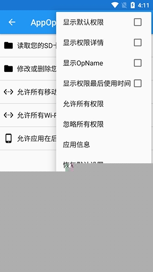AppOpsX提供了限制或忽略等更多选项,并能永久性忽略应用的某项权限请求,不再弹出提示框。