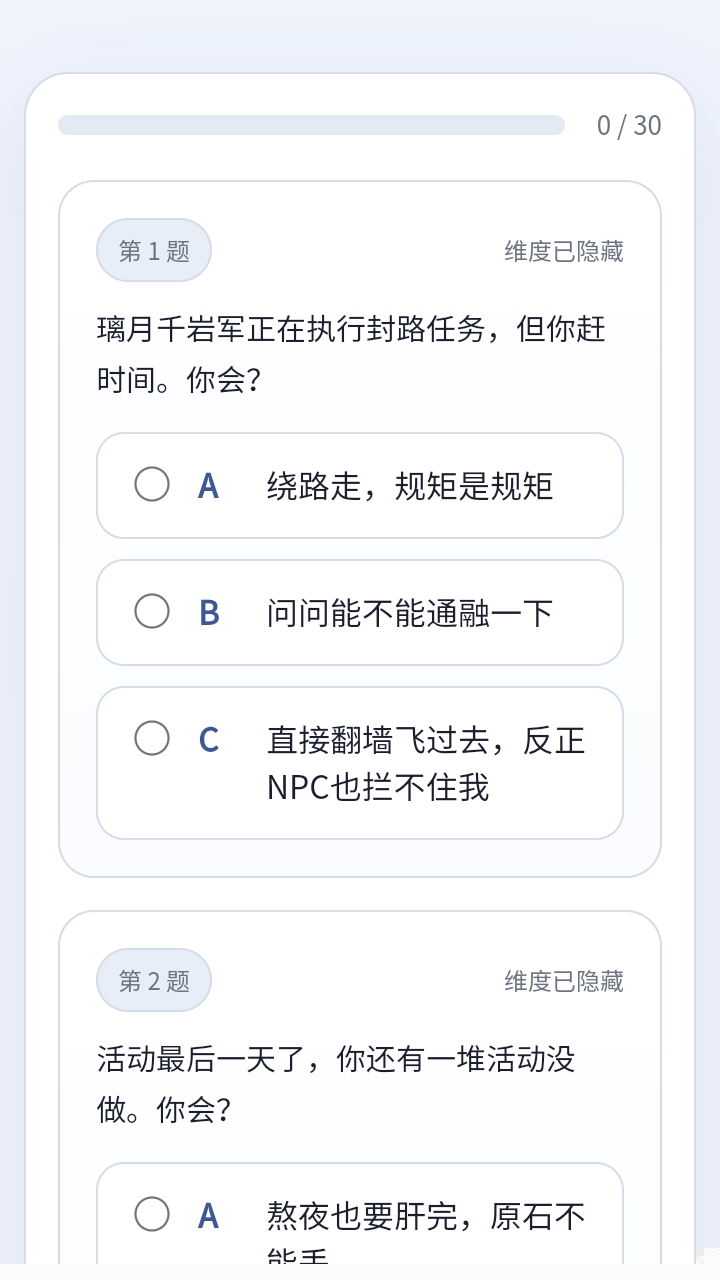 提供约30道基于原神游戏情节与价值观选择的情景式题目,引导用户在熟悉的叙事框架下做出自然反应。