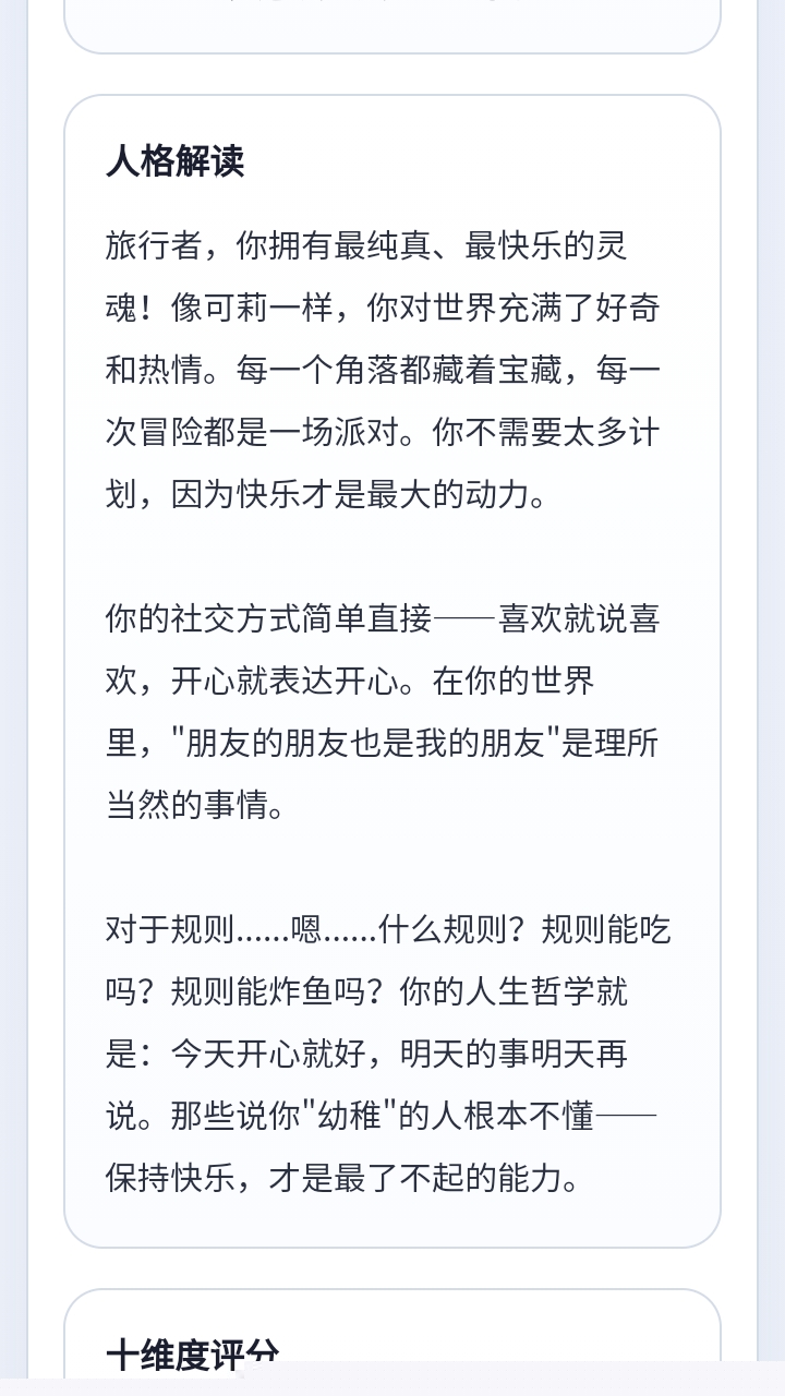 依据答题数据,从主导特质、角色映射、社交适配度等多个维度生成一份详细的个性化解读报告。