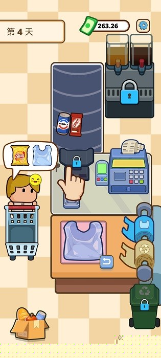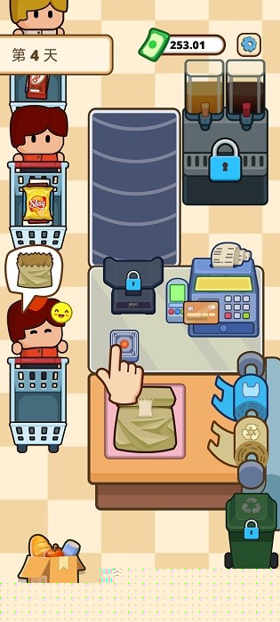核心体验围绕收银台展开,面对络绎不绝的顾客,首要任务是高效且准确地完成结账。屏幕下方会显示顾客的购物篮,需要快速点击并将商品拖拽至扫描区,系统识别后自动计入账单。所有物品扫码完毕后,需根据提示选择现金或电子支付方式,并计算应找零钱,任何延误或差错都可能导致顾客满意度下降。保持队伍移动速度是获得高评价的关键。
