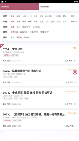 启动应用后,在主界面下滑即可找到插画约稿入口,点击进入后可以浏览当前所有开放的约稿需求。