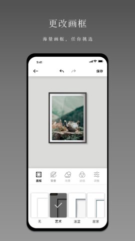 软件内集成一个持续更新的数字画框资源库,包含从古典油画边框、现代极简线条到趣味卡通造型等数千种设计,能够满足纪念照、风景摄影、人像艺术等不同题材的装裱需求。