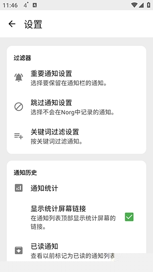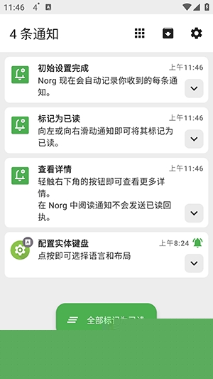 Norg是一款实用的设备通知管理软件能够帮助用户轻松找回那些被遗漏或已清除的消息提醒,通过系统化的管理方式一站式收纳所有通知内容,其交互界面设计得简洁友好且功能布局清晰直观,用户无需任何学习成本即可快速上手操作,兼容Android6.0及以上版本不需要root权限就能使用。