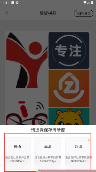 完成编辑后点击保存,在弹窗中可自定义图片清晰度,确保输出质量满足打印或上传需求。