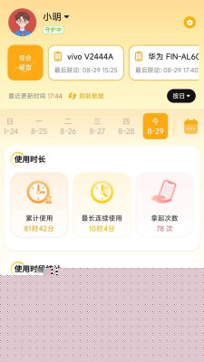 支持单个账号关联多台孩子设备,只需在家长端添加新设备并输入对应验证码,即可统一查看所有孩子的使用数据,无需切换账号。
