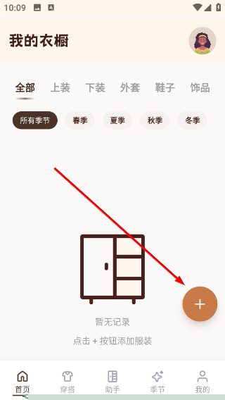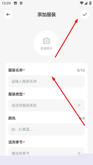 进入我的衣橱界面,点击右下角加号按钮,弹出添加页面。填写服装名称、类型(如上衣、裤子)和季节标签,可上传照片。完成后点击右上角对勾保存,单品自动归类到对应分类。