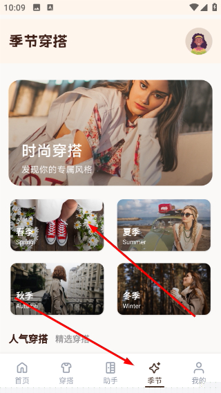 切换到底部导航栏的季节页面,按春夏秋冬筛选穿搭推荐,适配气温变化。