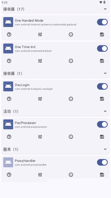 每个组件旁有四个图标:问号圆圈代表组件信息,点击可查看详细配置;设置图标表示Intent信息,用于传递数据;字母i圆圈是应用信息,显示包名和版本;软盘图标指向存储位置,方便文件管理。这些图标让调试过程更直观,我常用们快速定位问题。