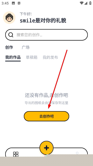 在软件主界面点击我的作品页面,找到去创作吧按钮并点击,即可进入图纸创作界面开始绘制。这个入口设计得很直观,第一次使用时我很快就找到了。