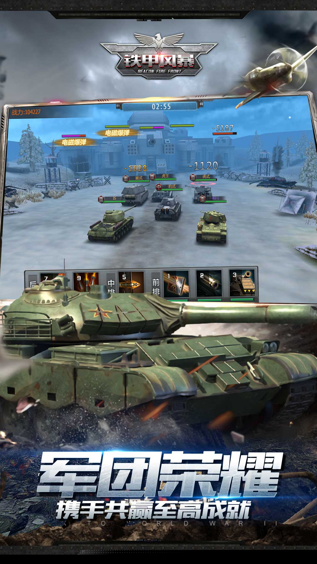 依据坦克的型号、属性与技能,进行前后排布阵与羁绊组合,构建攻防一体、协同作战的多编队战术体系。