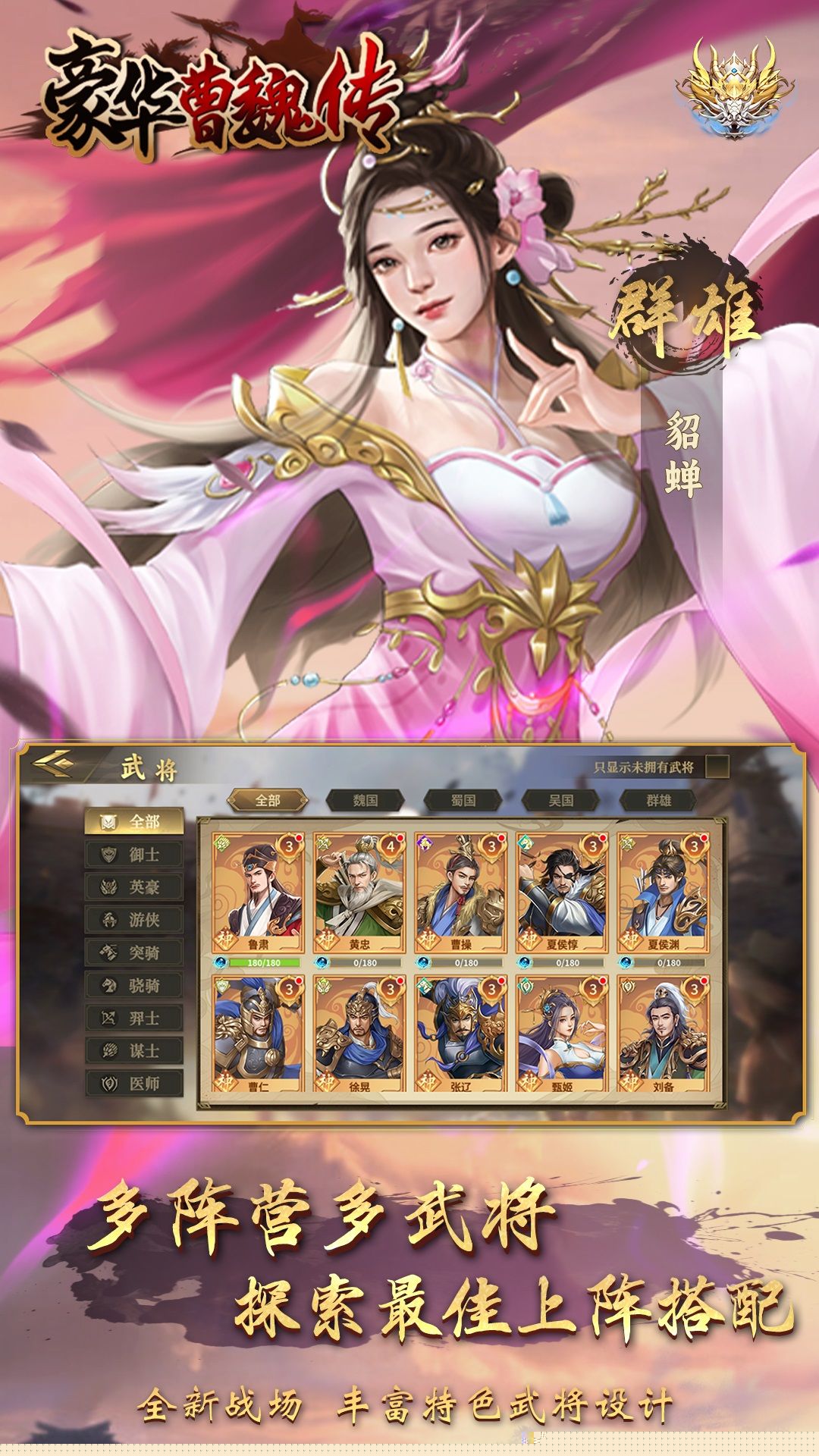 豪华曹魏传是一款以三国曹魏势力为背景,融合了传统战棋策略与角色养成要素的单机策略游戏。作品在经典战棋框架上进行了深度创新,通过宏大的历史剧本、丰富的武将特技以及多变的战场地形,构建出一个极具挑战性与沉浸感的三国策略世界。将扮演曹魏势力的统帅,在波澜壮阔的汉末舞台上运筹帷幄,体验从陈留起兵到一统天下的完整征程。