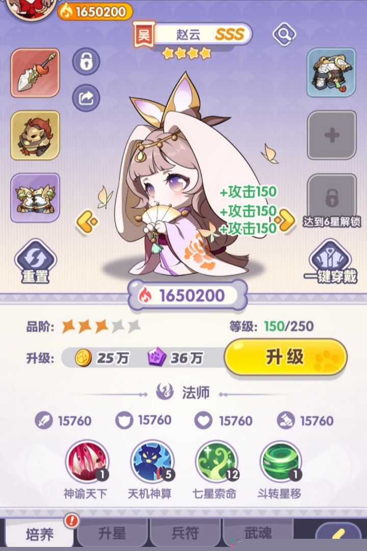 5、点击下方武将,武将可进行升级进阶,穿戴装备。