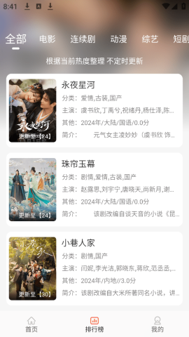 集成多个优质片源接口,实时同步更新,广泛覆盖国内外电影、剧集、综艺及纪录片。
