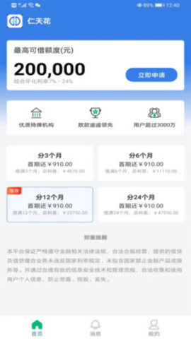 仁天花是一款由持牌金融机构重庆两江新区宝升小额贷款股份有限公司运营的线上信贷服务软件,专注于为有临时资金需求的个人用户提供高效、透明的数字金融软件。依托大数据风控与智能算法,能够在数分钟内完成信用评估与审批,流程清晰合规,借款利率与各项费用均明确展示,帮助用户便捷地解决日常消费、医疗应急、家庭装修等多种场景下的资金周转问题。