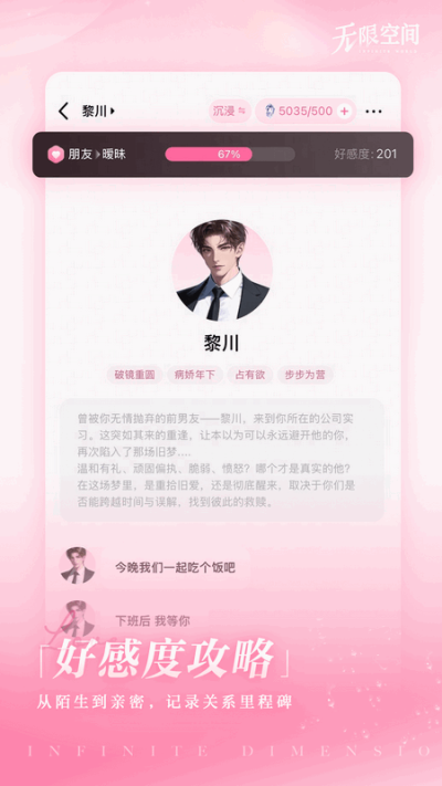 引入了一套隐性的关系成长系统。随着交互深度与频率的增加,用户与AI角色之间的亲密度参数会发生变化,并微妙地影响角色对话的亲密程度与开放度,模拟真实社交关系的演进。