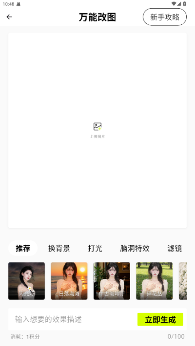 通过输入自然语言描述,直接生成符合语意的完整图像;或以上传的图片为基准,进行风格迁移、元素扩展与内容重构。