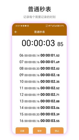 进入常规秒表模式,点击界面中央显著的启动按钮即可开始计时。过程中可随时点击暂停,并利用旁边的计次按钮记录关键时间节点。