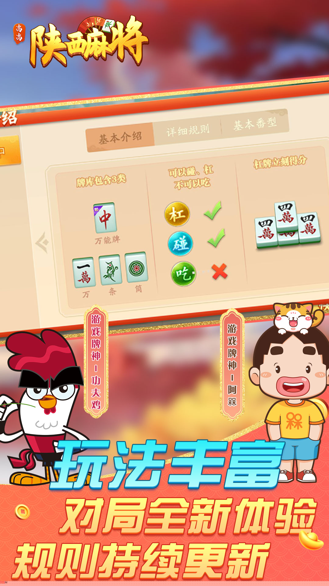 尚尚陕西麻将是一款融合了陕西地方特色的麻将游戏,以血流红中、血流成河、血战到底等经典玩法为核心,集成了斗地主、掼蛋、推倒胡、跑得快等多元化棋牌项目。其设计深入本地文化,规则正宗,画面精美,特效酷炫,并伴有可爱的牌宠系统,为提供了兼具传统韵味与丝滑流畅体验的线上娱乐平台,支持好友约局与全国匹配,满足不同的社交与竞技需求。