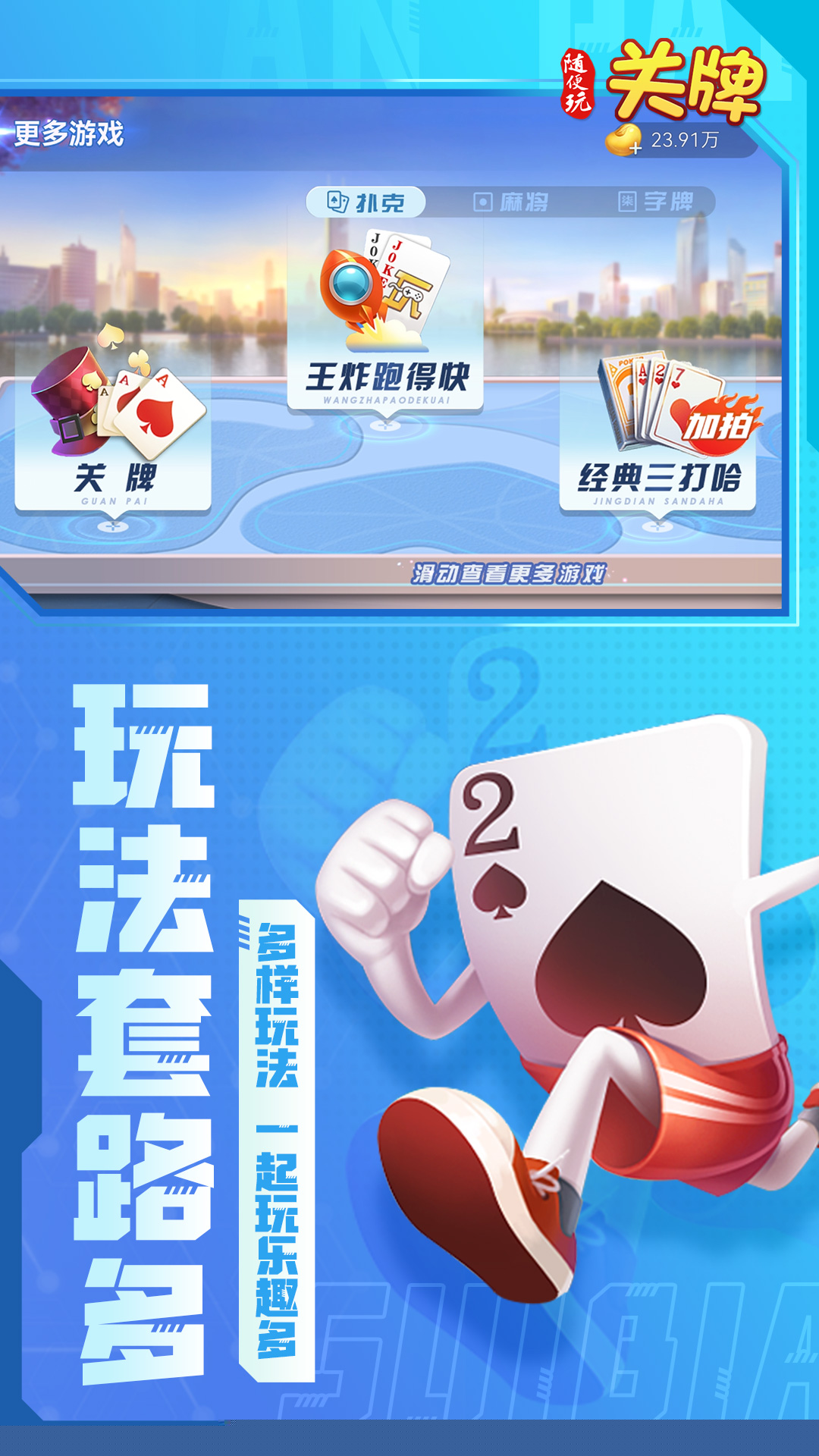 随便玩关牌是一款融合传统智慧与现代竞技乐趣的棋牌类游戏,源自江浙地区,现已凭借其独特的规则和快节奏的对抗风靡全国。游戏采用精简的41张牌组,支持三人同场竞技,过程紧张刺激且充满策略性,为提供了纯粹而富有挑战性的卡牌对决体验。