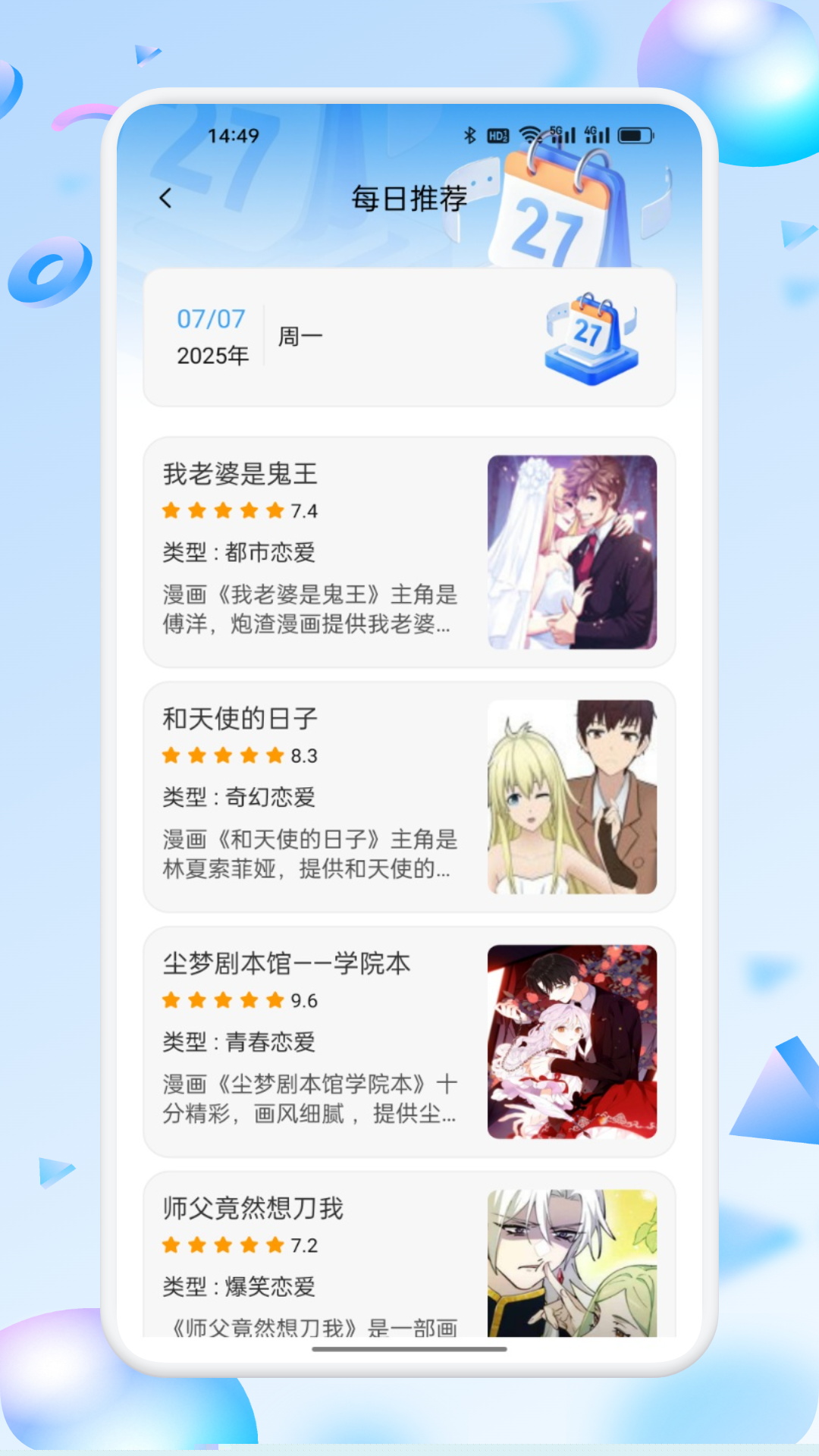 漫蛙Manwa2是一款集漫画阅读与数字绘画于一体的综合性软件,整合了海量的漫画资源与便捷的创作工具。软件通过智能算法分析用户偏好,提供个性化的漫画发现与推荐服务,覆盖恋爱、奇幻、冒险等多种流行题材。内置的专业画板功能为绘画爱好者与内容创作者提供了随时记录灵感、进行练习与创作的数字空间,打造一个集内容消费与创意生产于一体的娱乐平台。