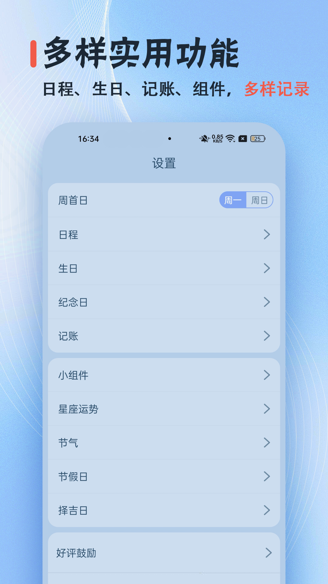 聚合智能日程提醒、生日纪念日管理、节假日信息、星座运势查询及择吉日服务,并与系统日历同步,构建了一个集中化的个人生活信息管理中心。
